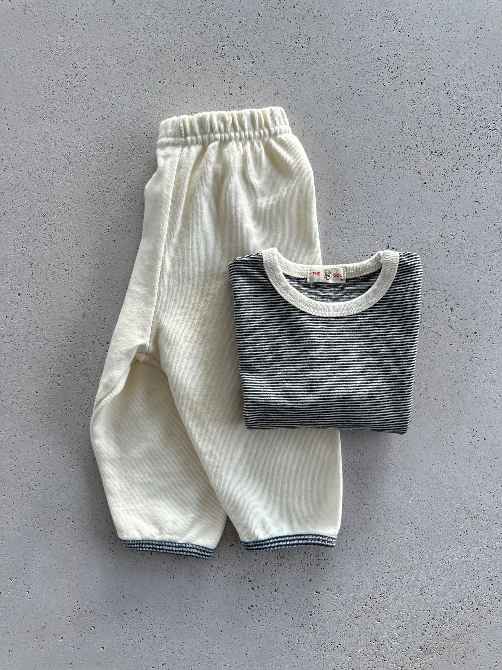 Introducing the Bebe Lou soft pants in cream—a wardrobe essential that's as delightful as it is practical. These cozy bottoms feature a charming blue-striped border that adds just a touch of personality without compromising that timeless, versatile look. Crafted from wonderfully soft fabric, they're designed to keep your little one comfortable and content all day long, whether they're playing, napping, or exploring their world.