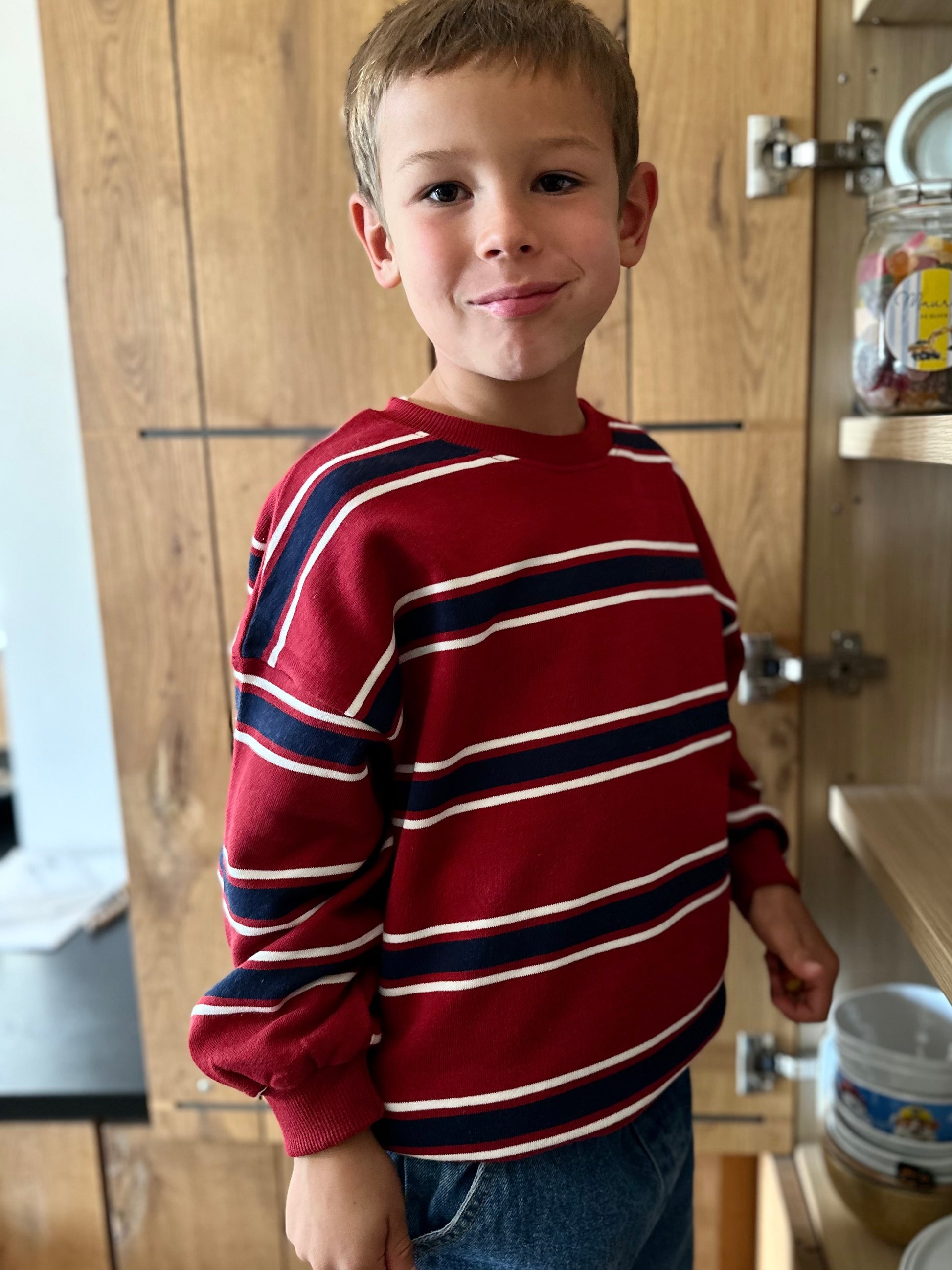Snuggle your little one into our delightful 'Dotti stripes sweater'! This cozy sweater features a fun, classic striped design and is available in two beautiful shades: soft Cream or rich Wine red. It's the perfect comfortable layer for school days, weekend adventures, or just relaxing at home. Warmth meets playful