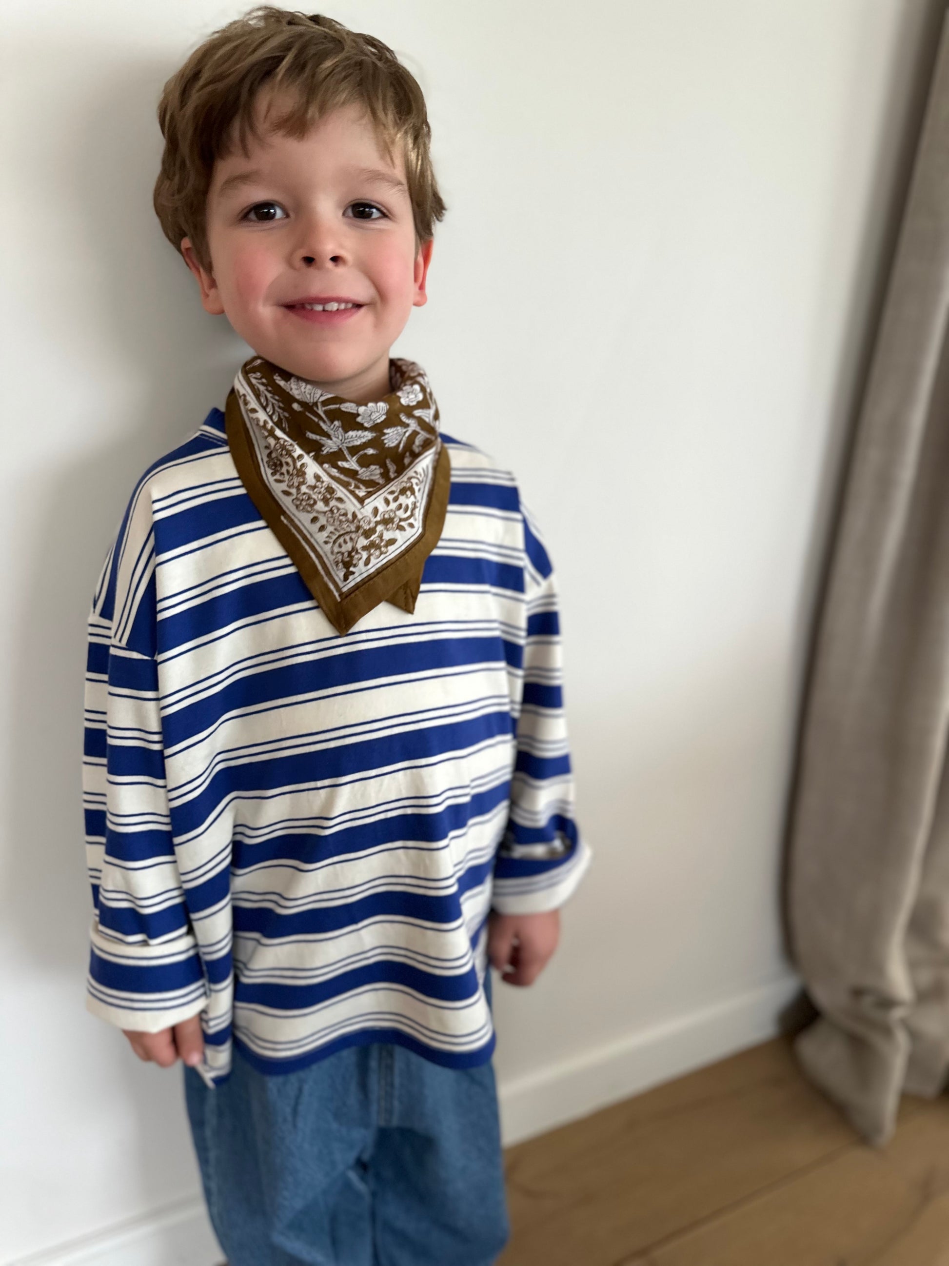 The little scarf that makes a difference ♡ Designed for children (50x50 cm), this scarf is the perfect accessory to add a touch of style with softness. Lightweight and practical, it can be worn around the neck, in the hair, or even hung on a small bag. Each scarf is handcrafted and printed in Jaipur using traditional blockprint technique. Patterns are applied by hand, making every piece unique. Small color variations may occur, and that's what gives them their charm.
