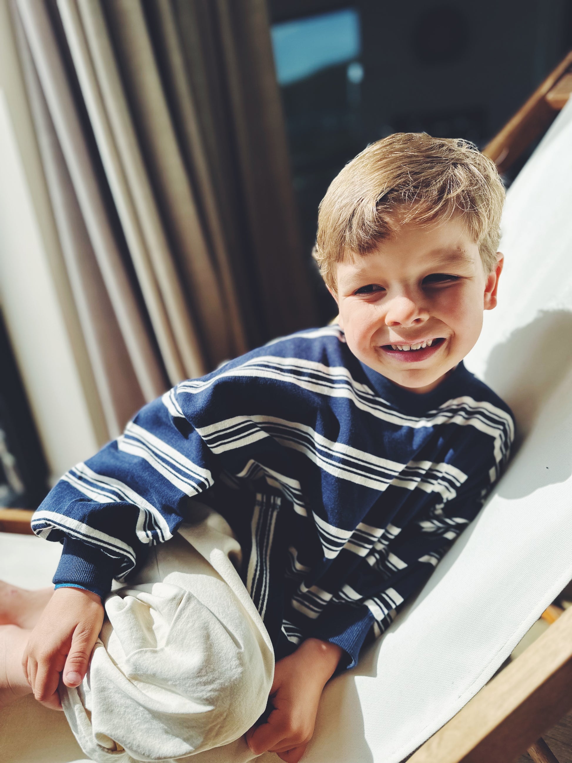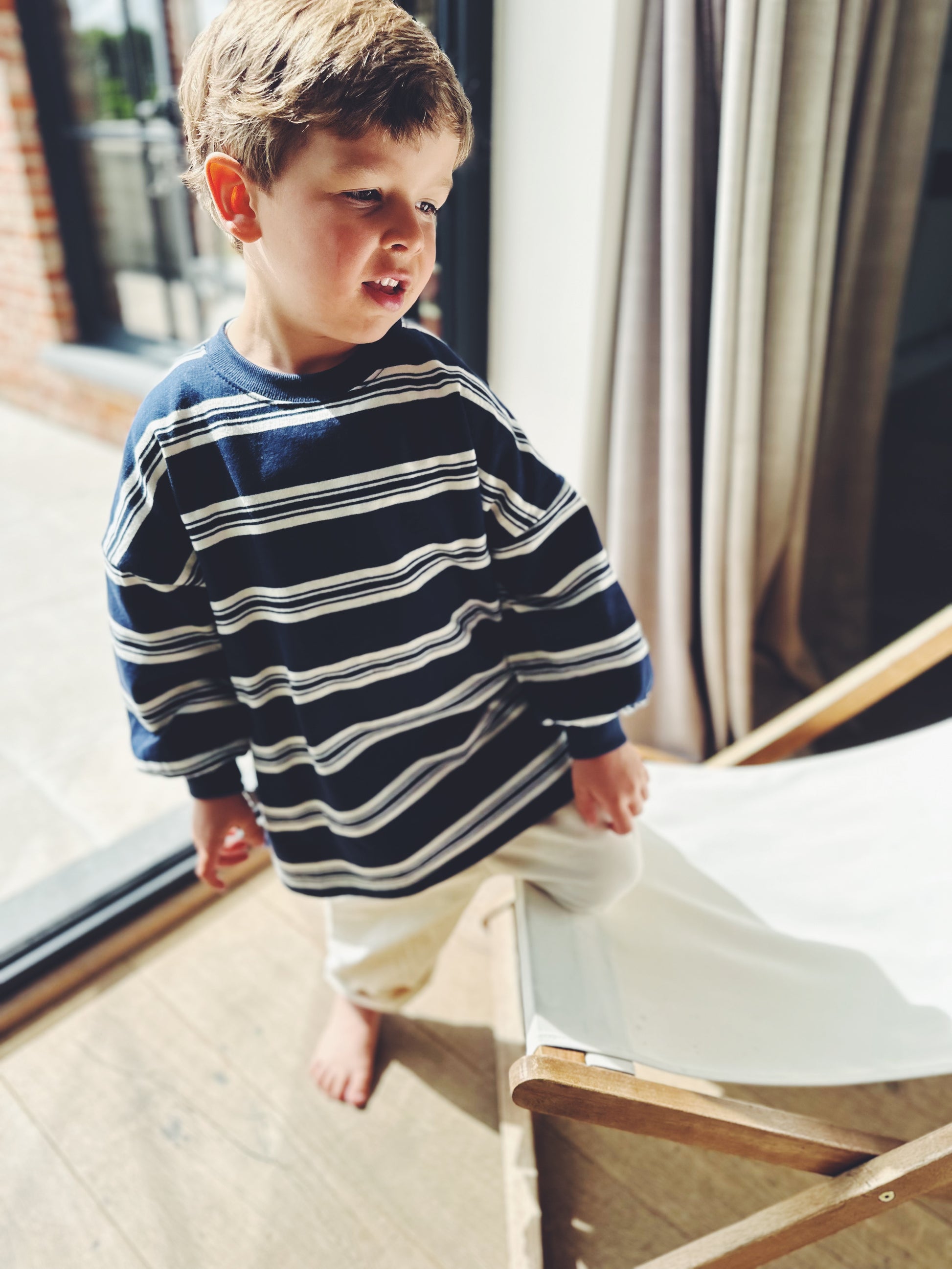 A navy sweatshirt with ecru stripes and playful side splits. Classic design with a contemporary edge—perfect for layering or wearing solo. Runs generous in size.