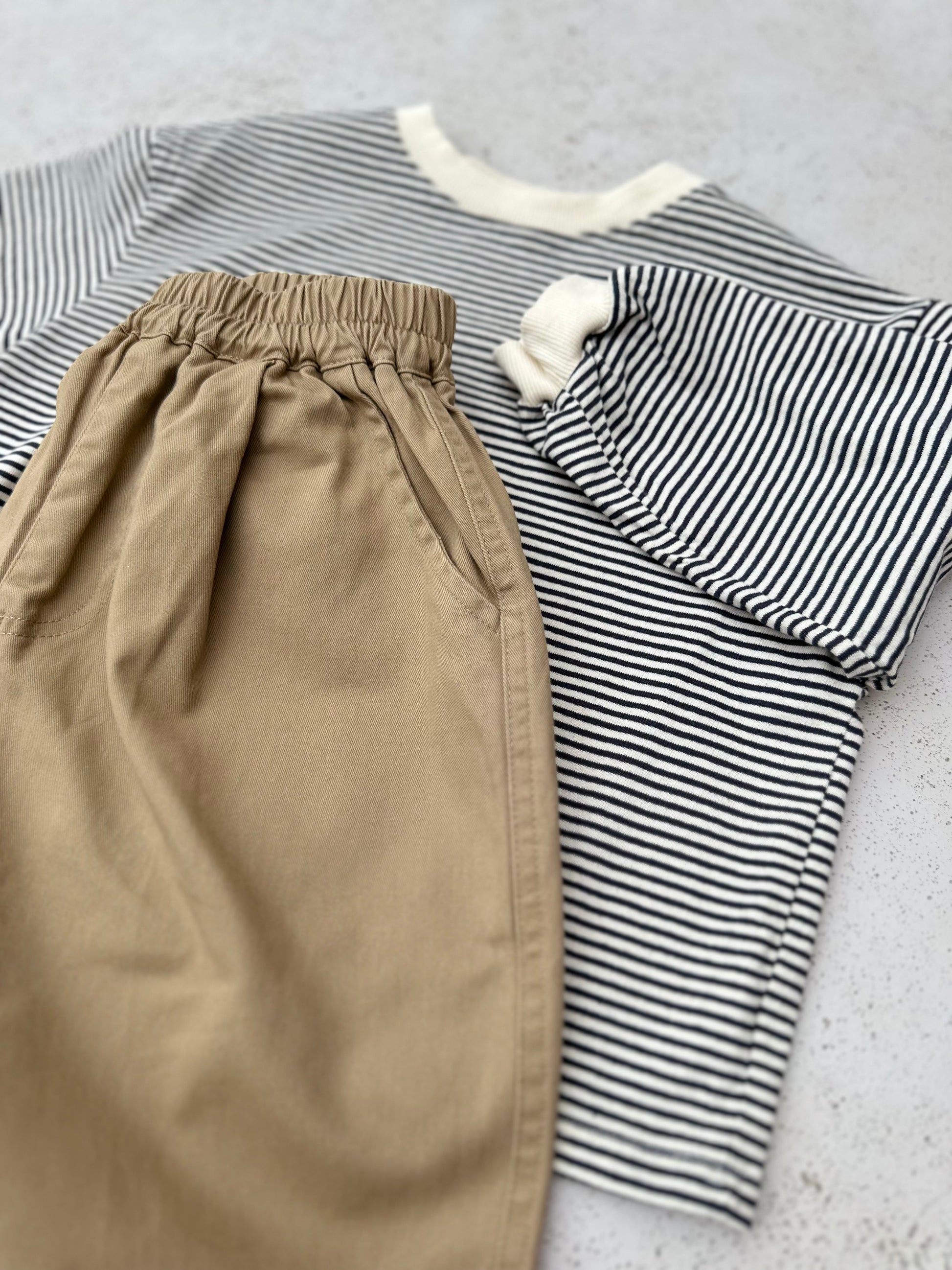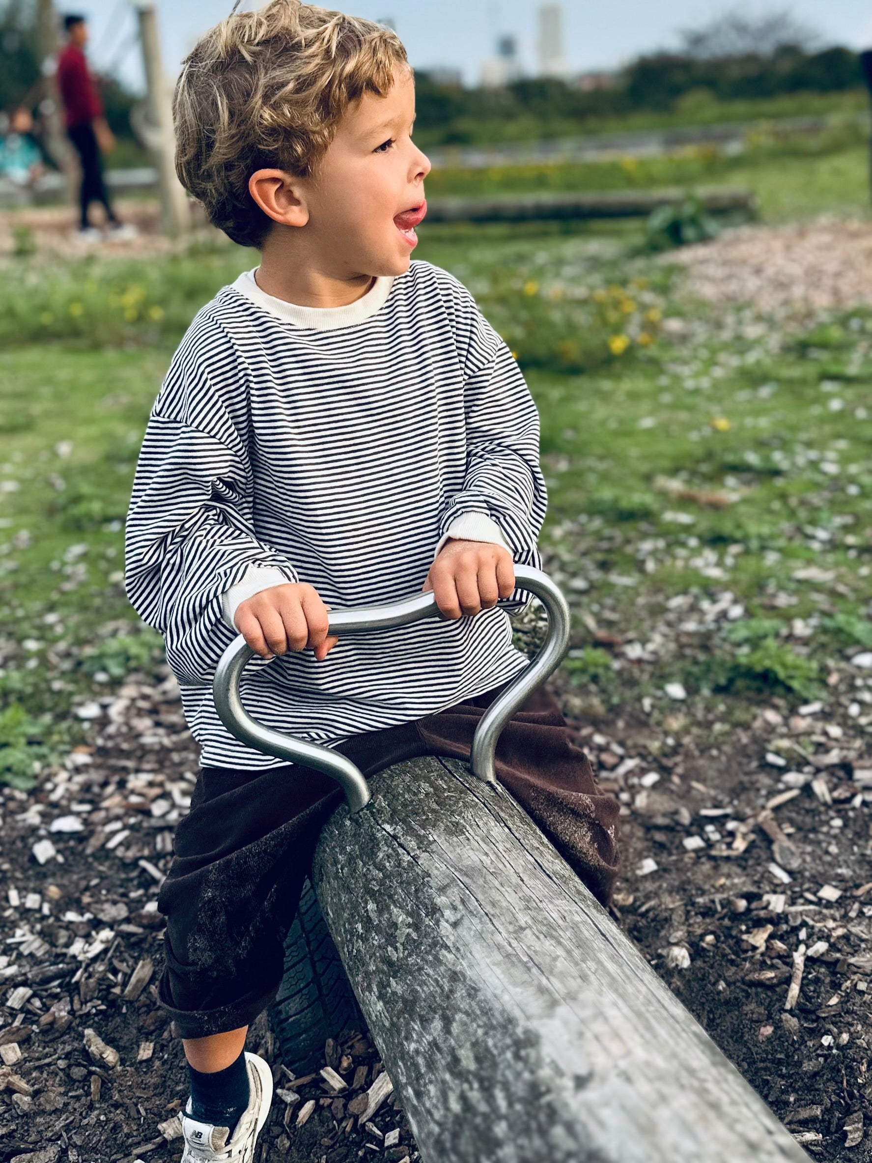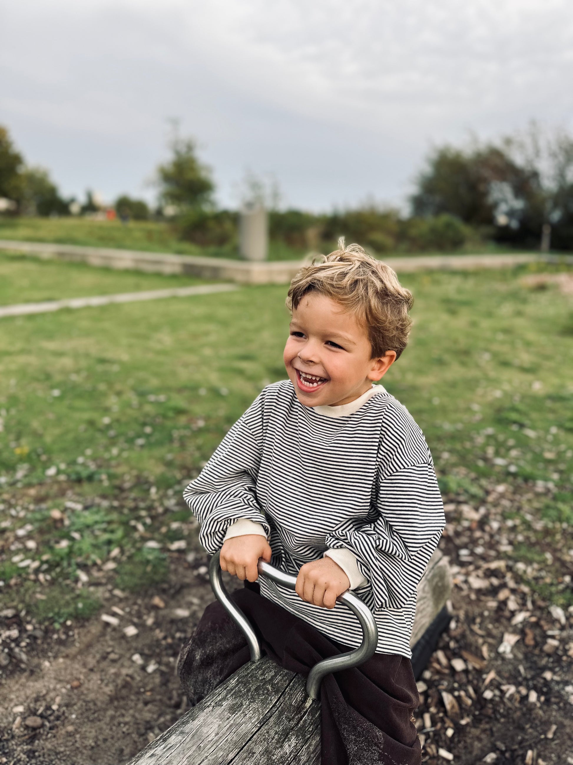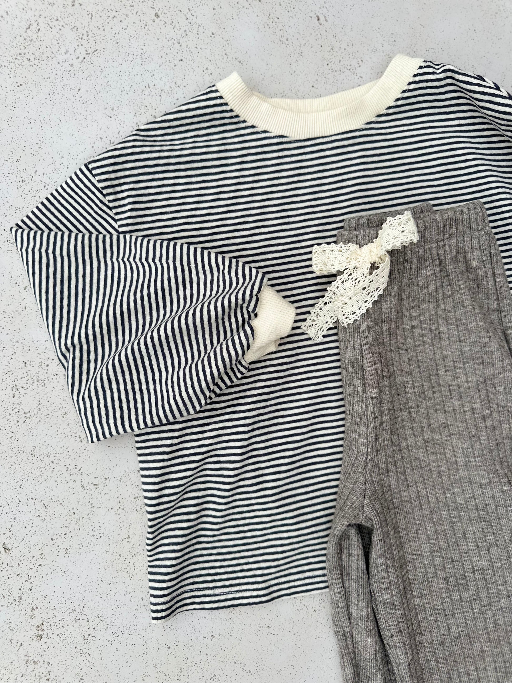 Stay comfy and cool in our Melmel loose sweatshirt. This effortlessly stylish piece features classic charcoal stripes with a clean ivory neck and cuffs, all in a relaxed, loose fit that's perfect for play. It’s an easy-to-wear favorite for every day.