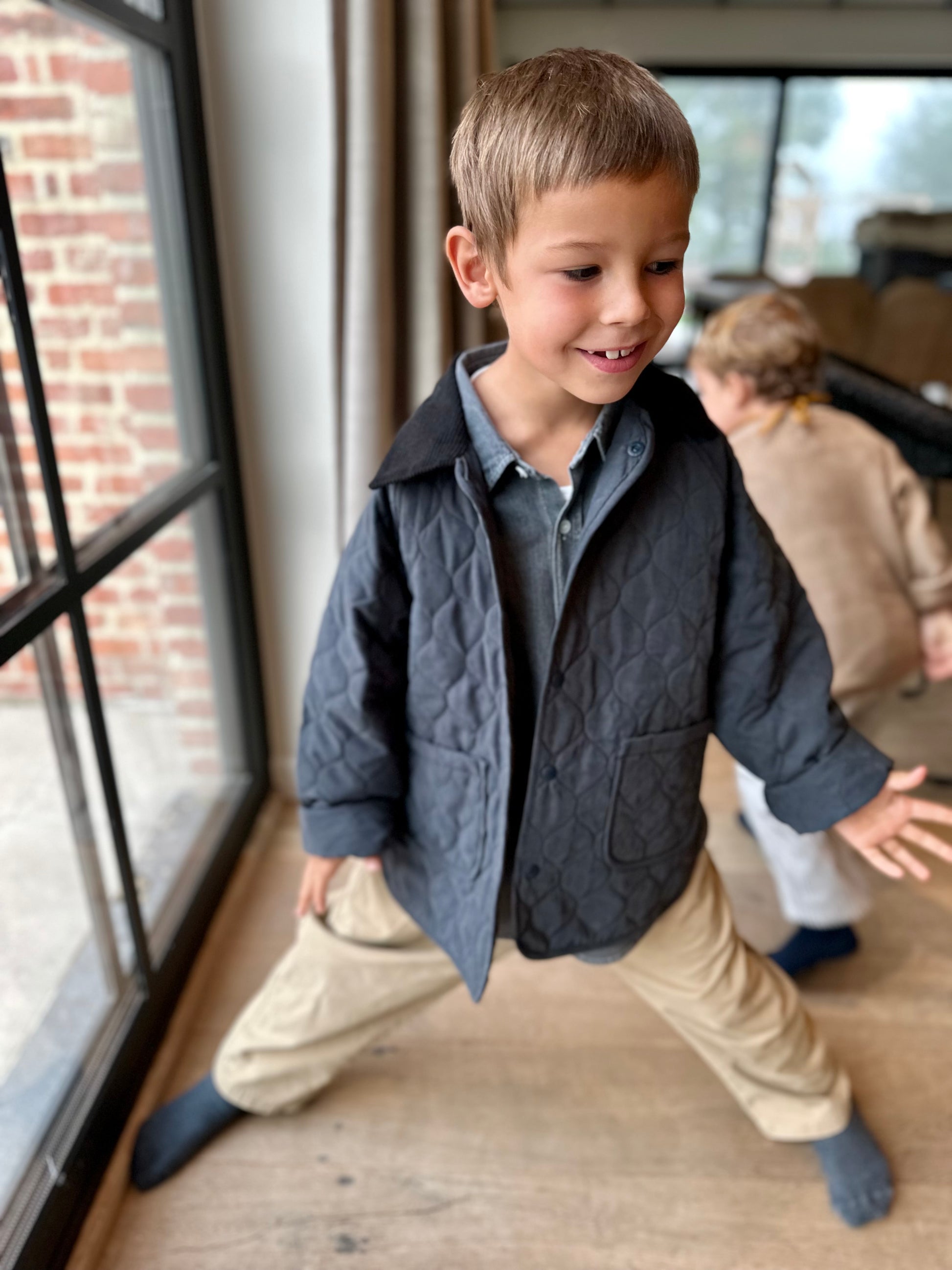 Keep them warm and looking cool but cute in our Quin collar quilted jacket - navy. With its cozy quilted design and oversized fit, this navy jacket with corduroy collar is perfect for chilly adventures and stylish layering all season long.